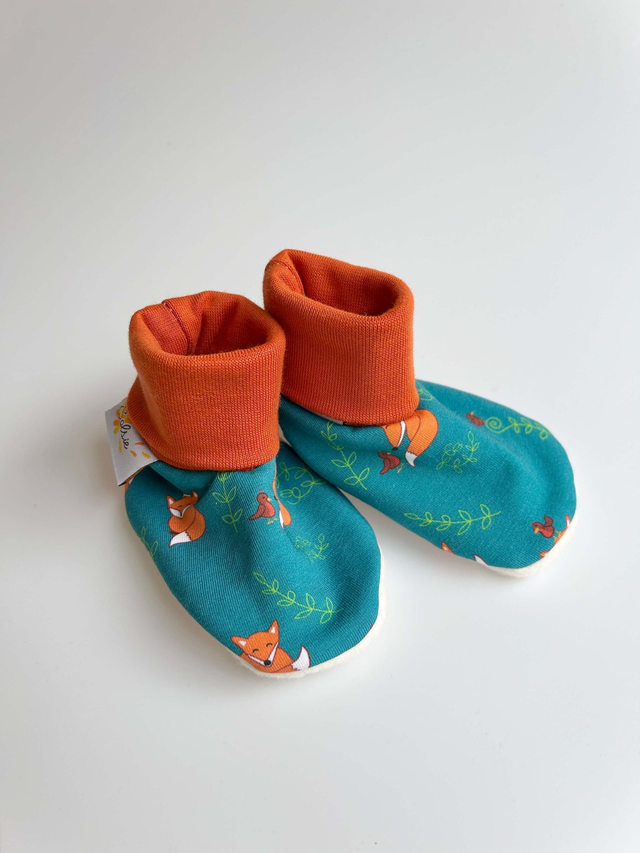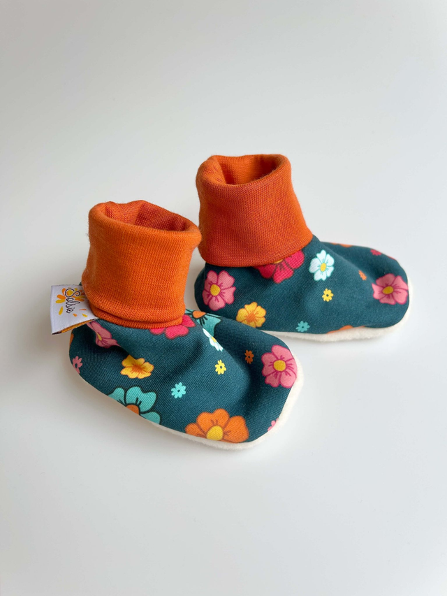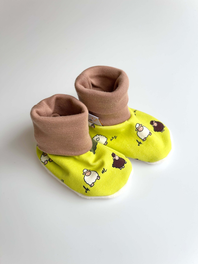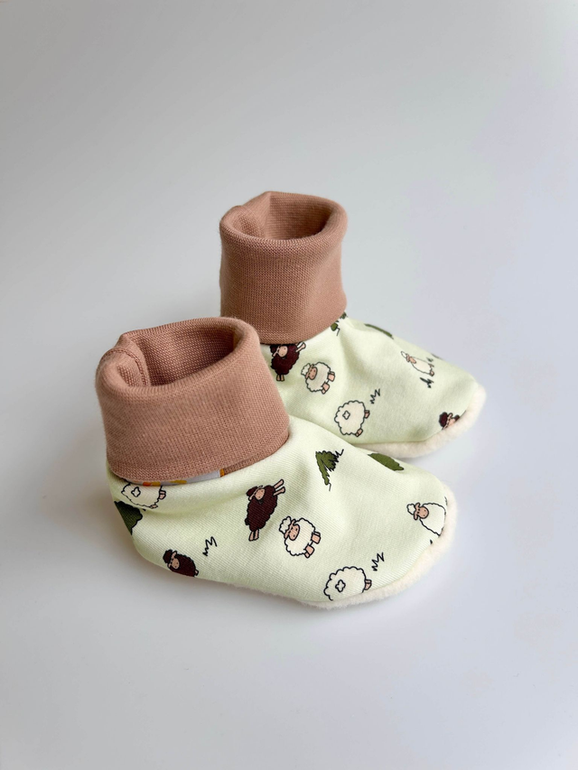 Ces petits chaussons, conçus avec les tissus utilisés pour les vêtements et à la semelle en polaire sont parfaits pour les premiers mois, quand bébé ne se déplace pas encore !