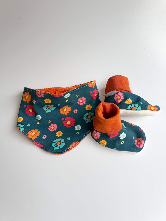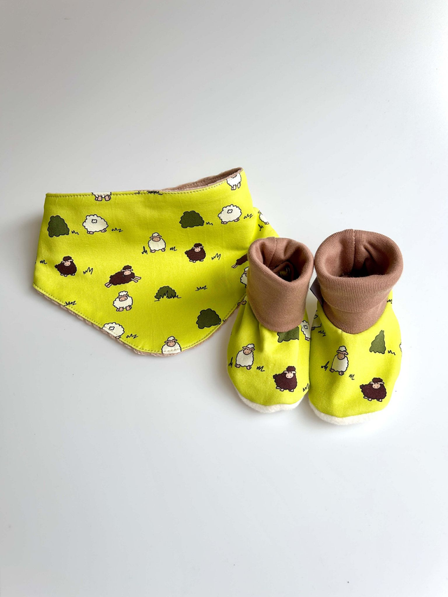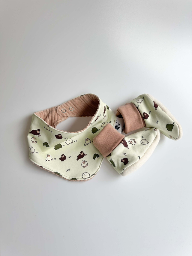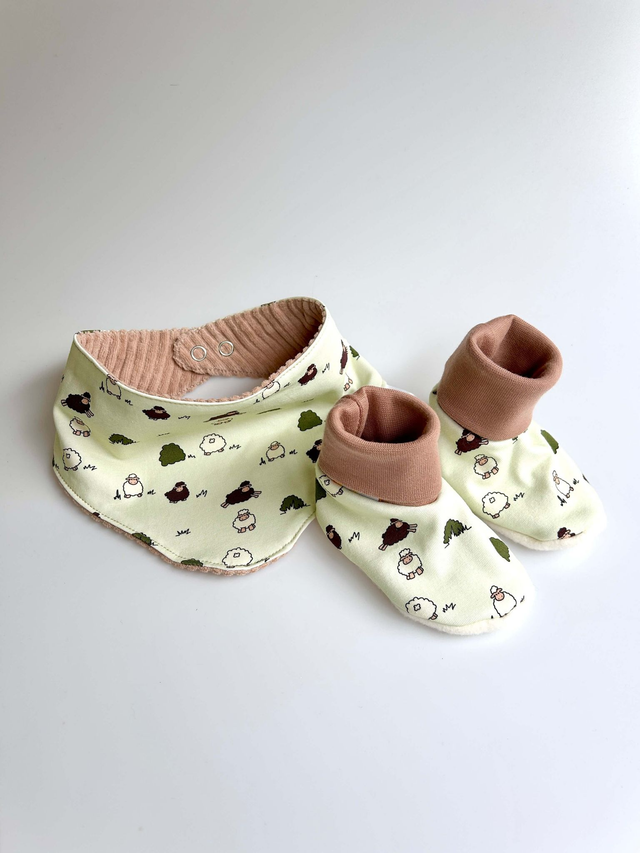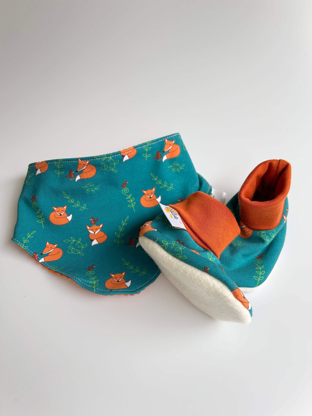 Coffret chaussons 0-6 mois + bavoir bandana Collection «Rouki et Capucine»