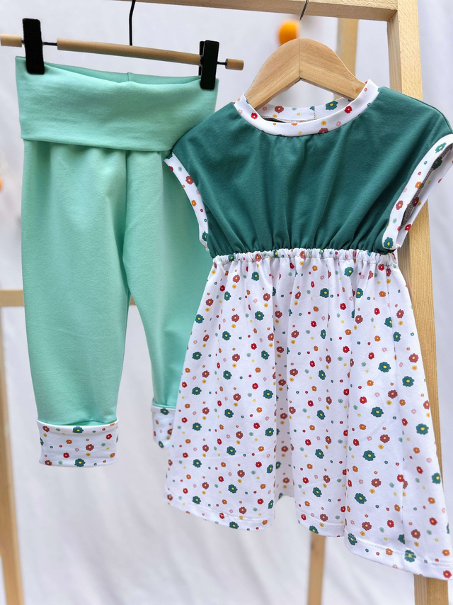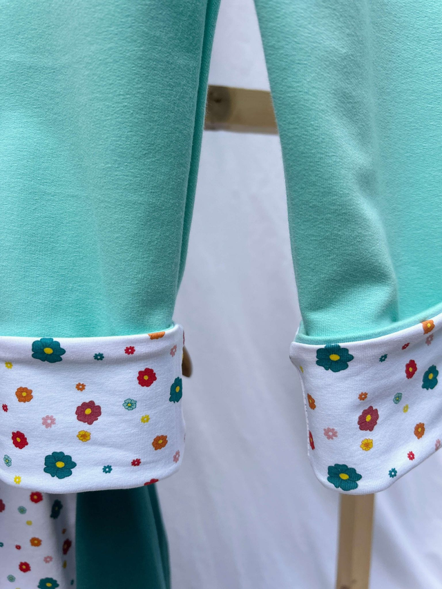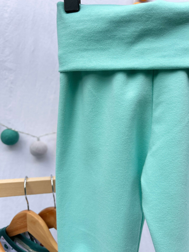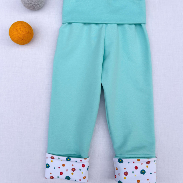 En french terry, le tissu utilisé pour les jogging ou sweats légers, il est solide et confortable, couleur turquoise, il offre confort et liberté de mouvement, parfait pour la motricité libre et les couches lavables.