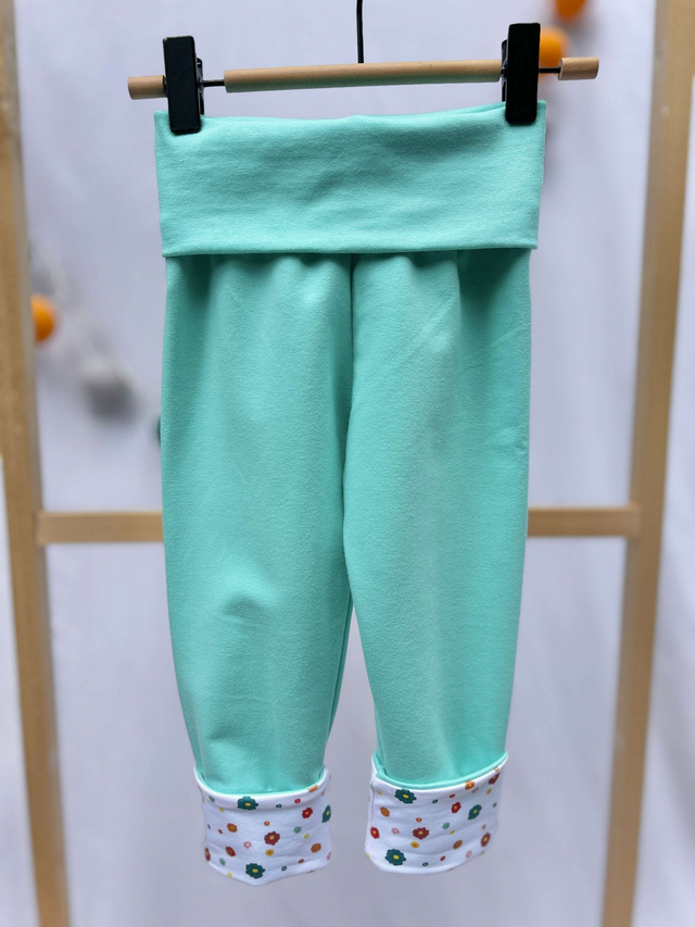La ceinture en tissu bord-côte se plie pour s'ajuster à la taille de l'enfant. Le bas du pantalon s'ajuste par des ourlets. Ce modèle reste assez long en fin de taille pour bien couvrir les mollets de bébé lorsqu'il est porté en écharpe ou porte-bébé. il grandit en même temps que lui et remplace plusieurs tailles classiques.