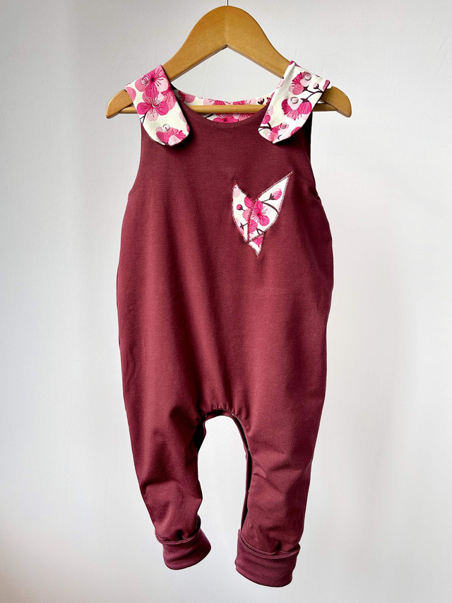 Son tissu jersey souple en coton bio GOTS, aux motifs fleurs de cerisier et bordeaux, assure confort, durabilité et liberté de mouvement, y compris avec des couches lavables.